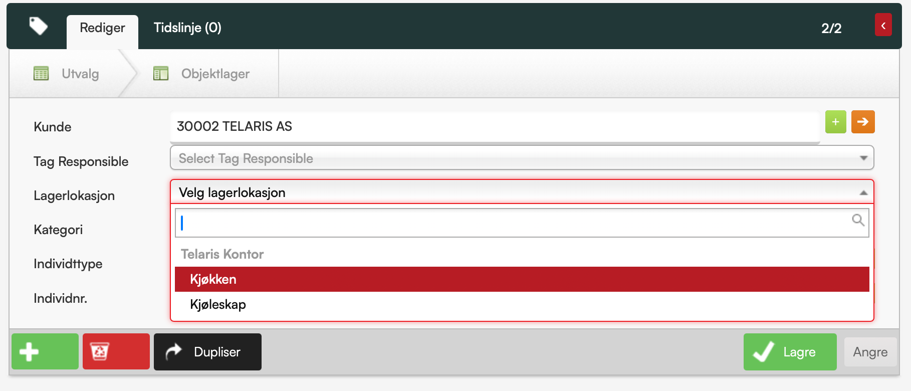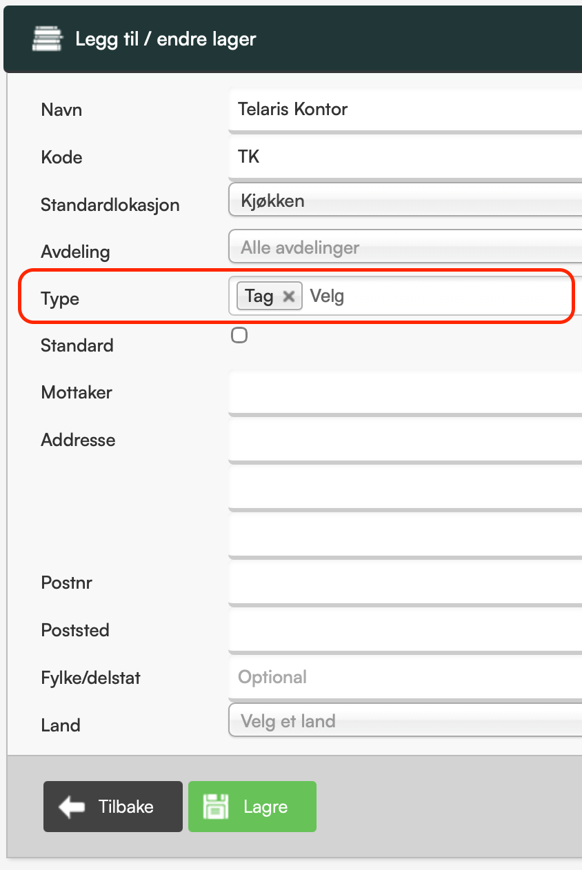 Når både lageret og objekt-/tagtypen er korrekt konfigurert, vil feltet «Lagerlokasjon» vises på objektet/taggen og kunne velges.
