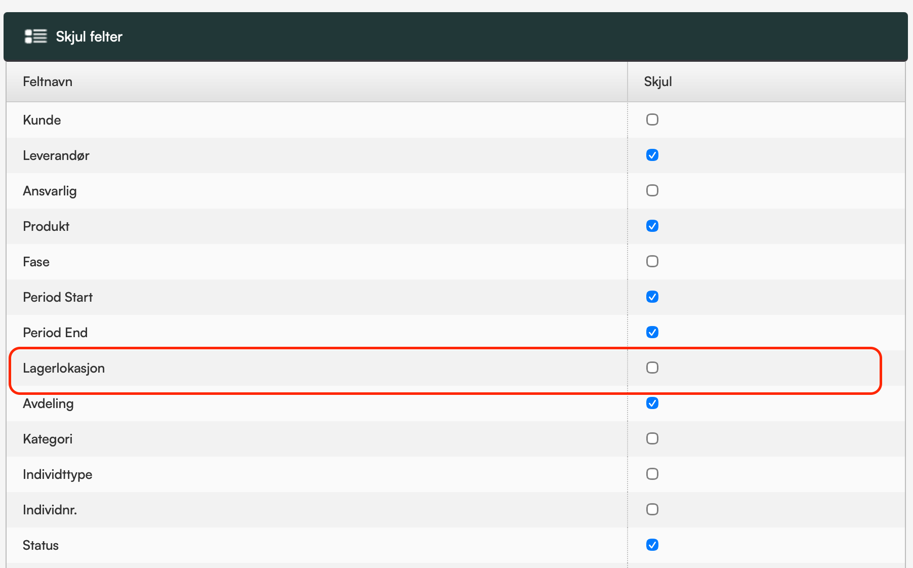 På aktuell objekt-/tagtype (også kalt individtype) må du kontrollere at feltet «Lagerlokasjon» ikke er skjult.