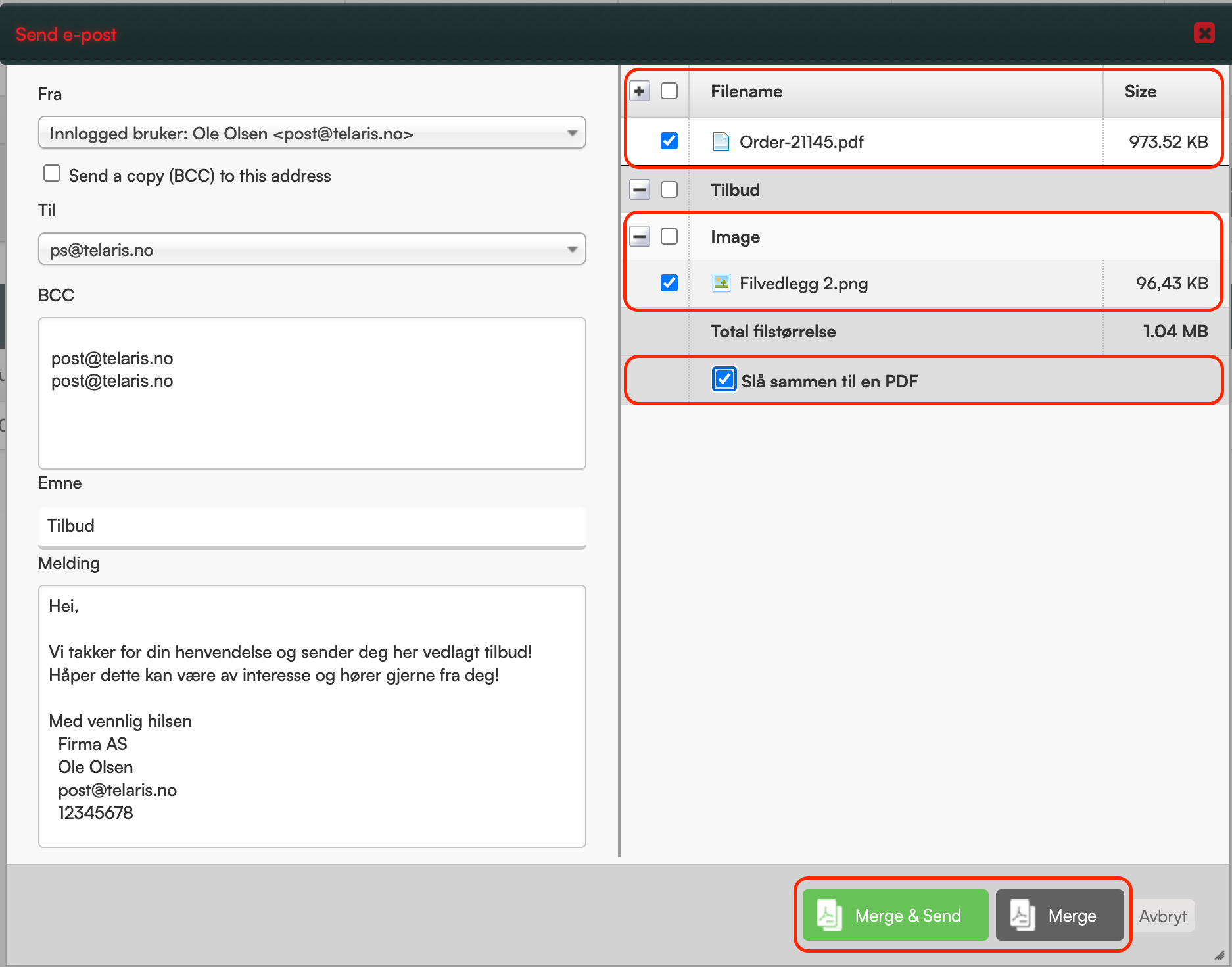 Man da kan trykke "Merge" som bare lager ny PDF fil, eller "Merge & Send" som slår sammen filene og sender ut e-posten