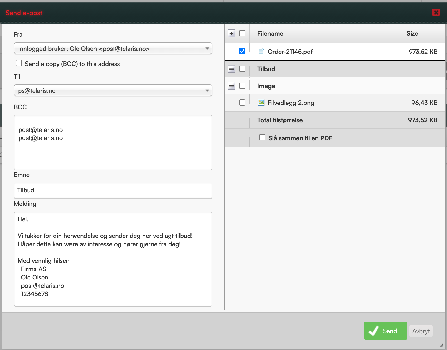 Ved utsendelse av tilbud og faktura får man valget om å legge til filene som vedlegg. Der har man valget mellom å legge til fil(ene) som vedlegg til eposten. Filene blir sortert der de kommer fra i ordreprosessen, samt under hvilke dokumenttyper som er lastet opp