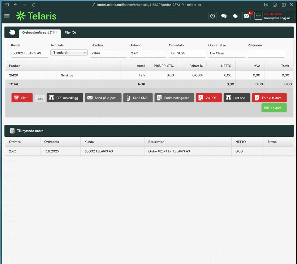 For å lage ordrebekreftelse, marker ønskede ordrelinjer og trykk 'Ordrebekreftelse'