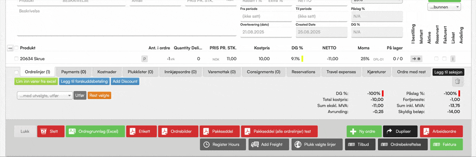 Ved å legge minuslinjer i en ordre, vises et symbol til høyre i ordrelinjen en knapp for å legge varer til lager.