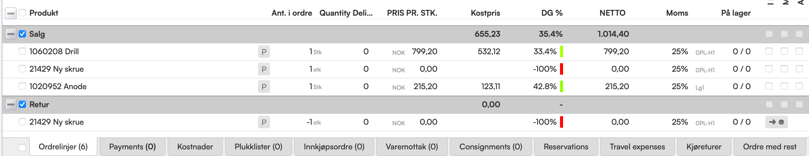 En ordre kan settes opp som bildet under, med seksjoner som deler inn returen for seg selv, slik at det er enklere og mer oversiktlig å jobbe i ordren.