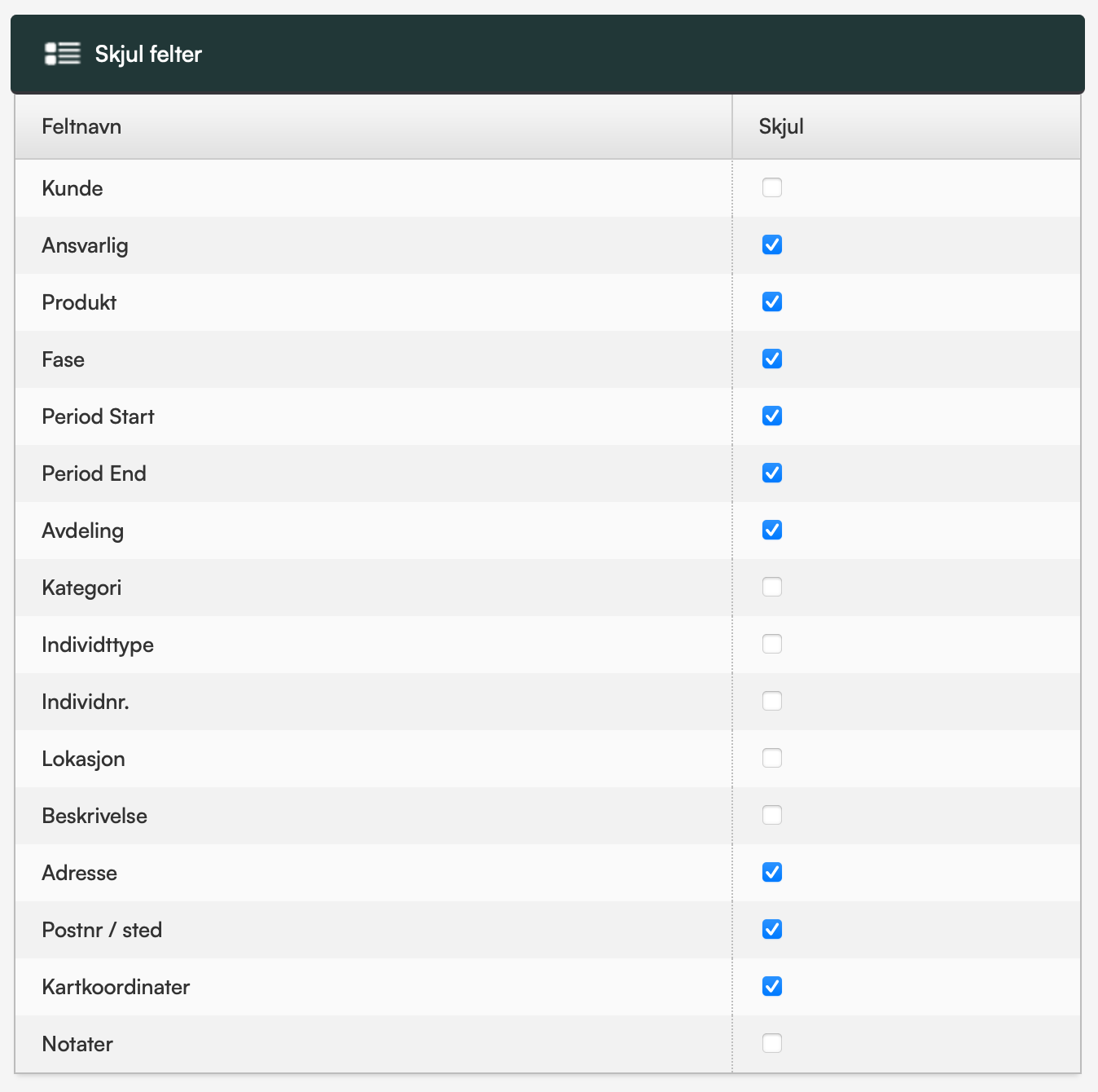 Objekter har støtte for å vise og skjule standardfelter pr objekttype