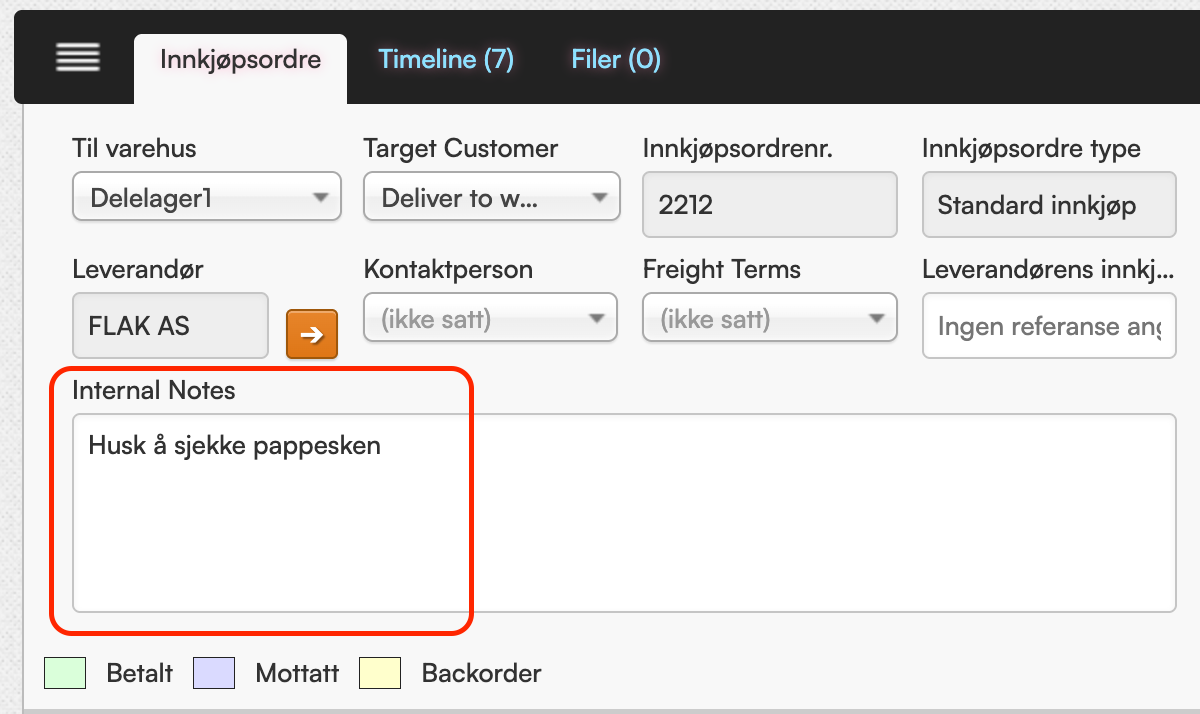 Å kunne legge igjen beskjed fra innkjøp til ordre, slik at det opprettholdes god kommunikasjon mellom lager og ordreansvarlig