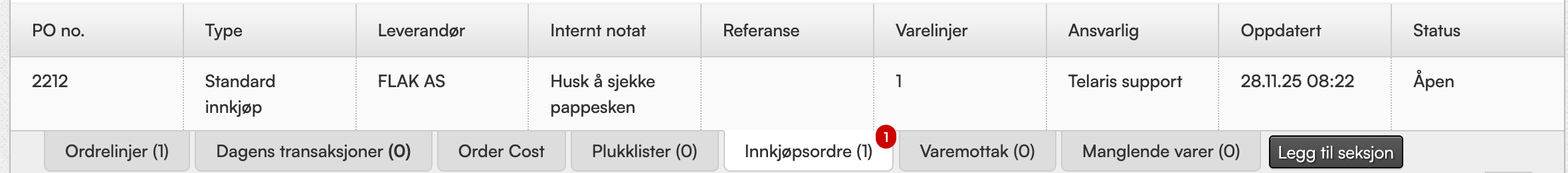 I ordren vises det et varsel på innkjøpsordrefanen når det ligger en kommentar på innkjøpet