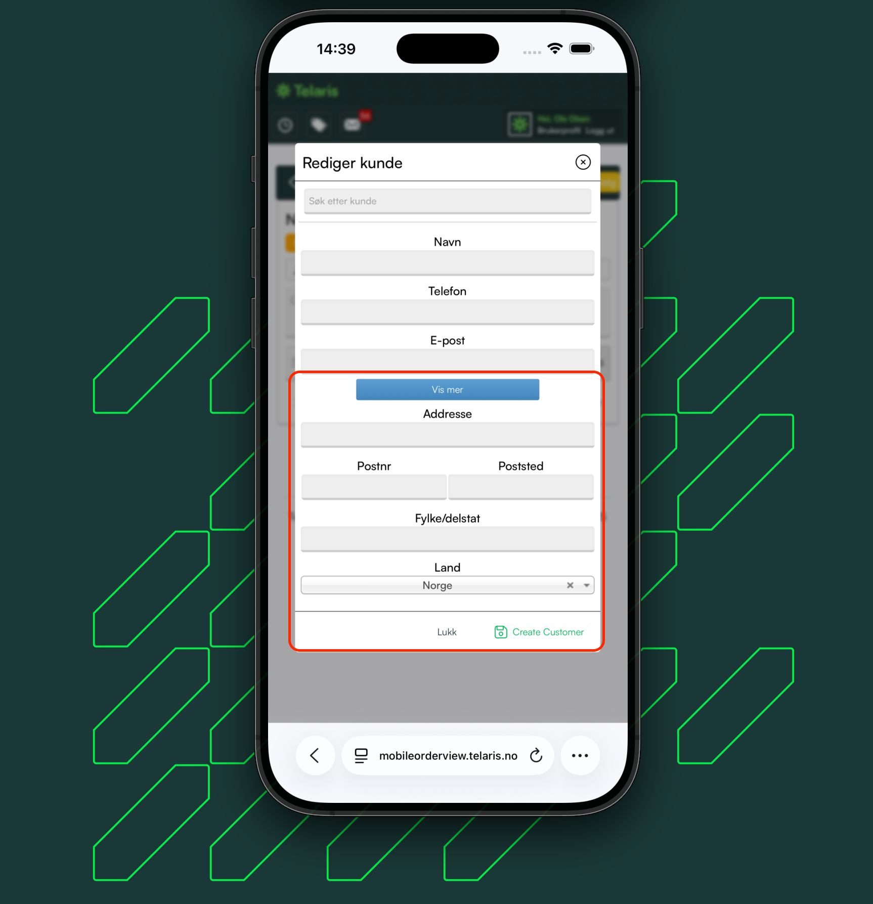 For å opprette en ny kunde i en ordre bruke tilnærmet samme funksjonalitet som desktop. Man får kan opprette ny kunde og fylle ut begrenset med informasjon på kunden.