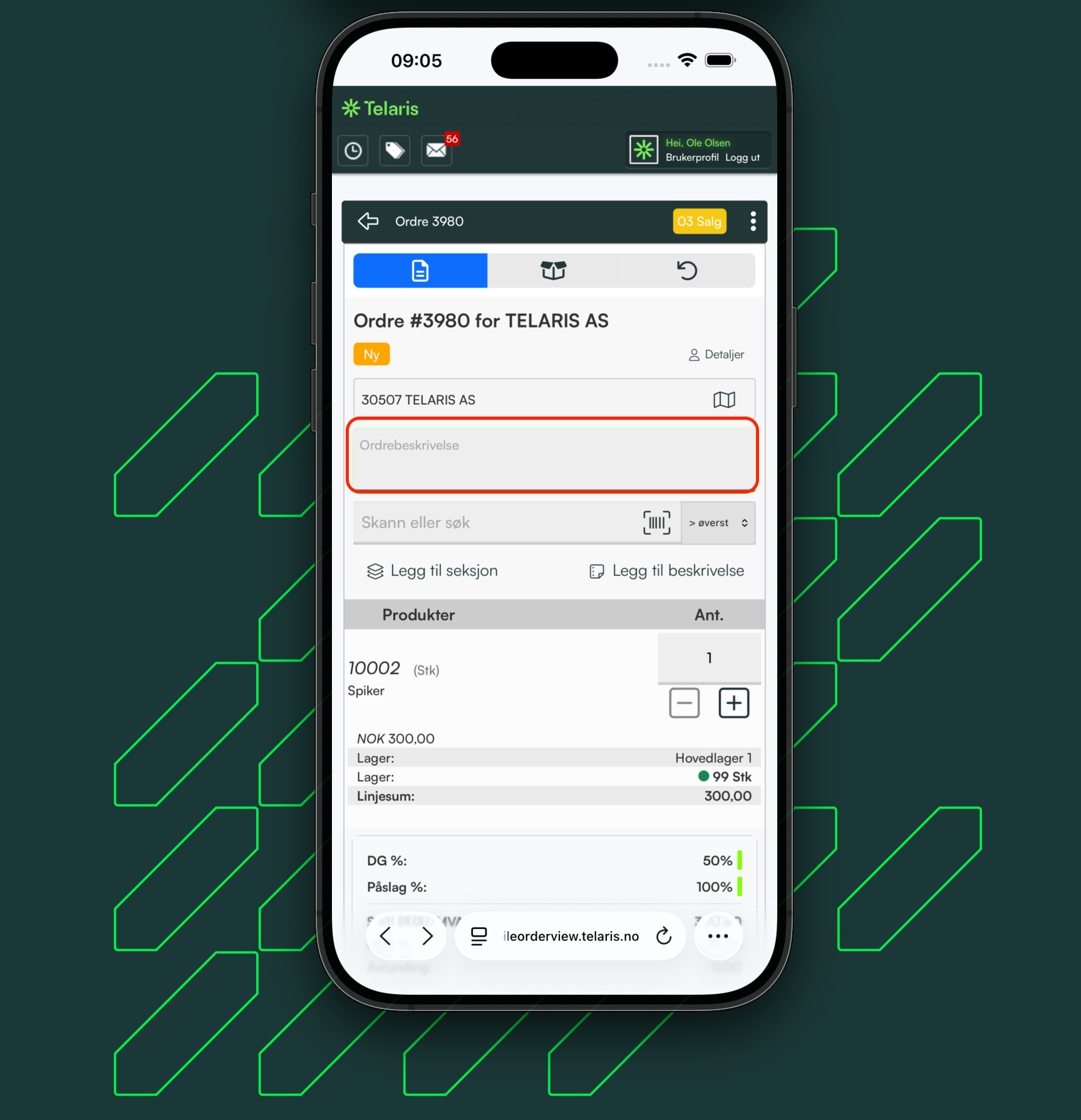 Ordrebeskrivelse hentes og skrives til samme sted i ordrevisningen på desktop-versjonen av Telaris.