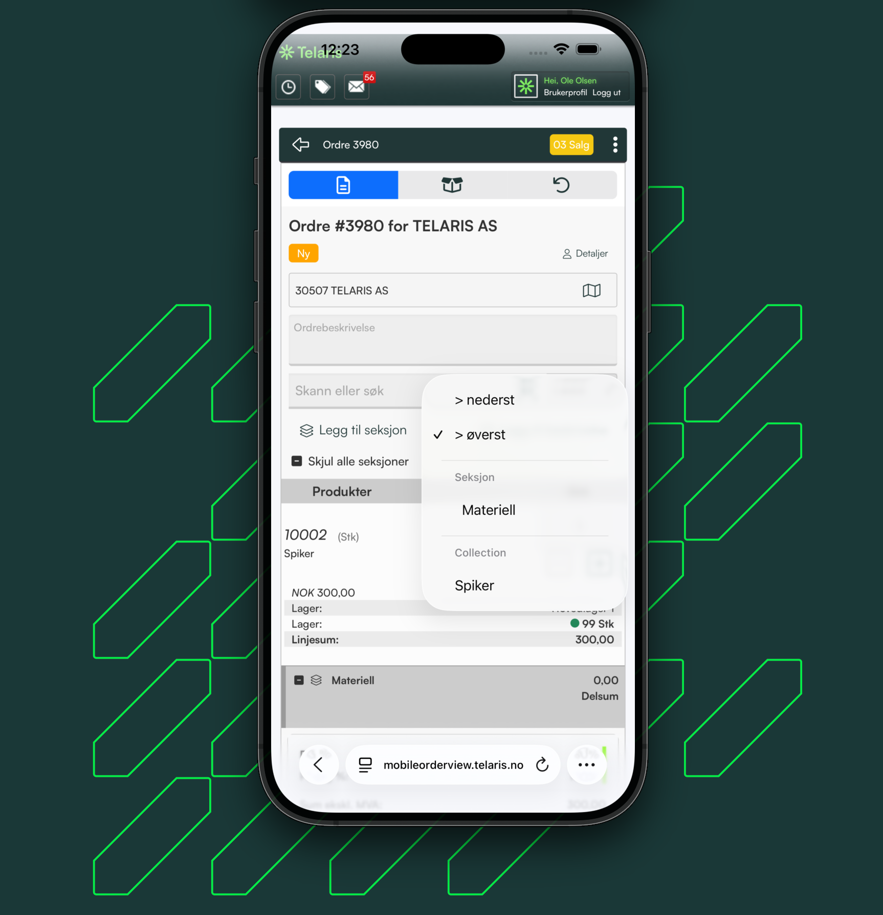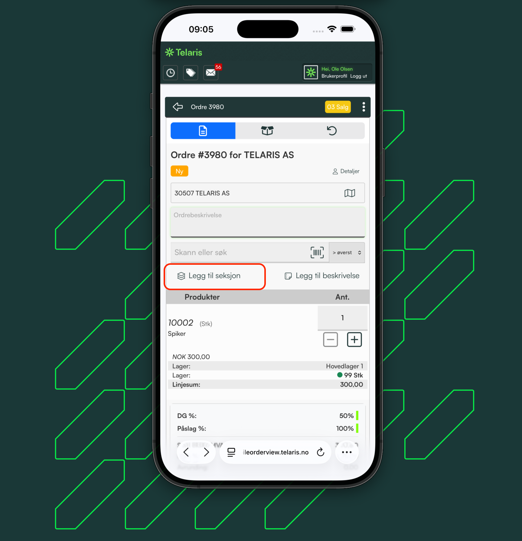 En seksjon kan opprettes i mobilt ordreview. Seksjoner vil vises likt som på desktop-versjonen, men i mobilvisningen kan de ikke flyttes. Produkter må legges til i seksjoner ved hjelp av knappen for valg som ligger på produktsøklinjen