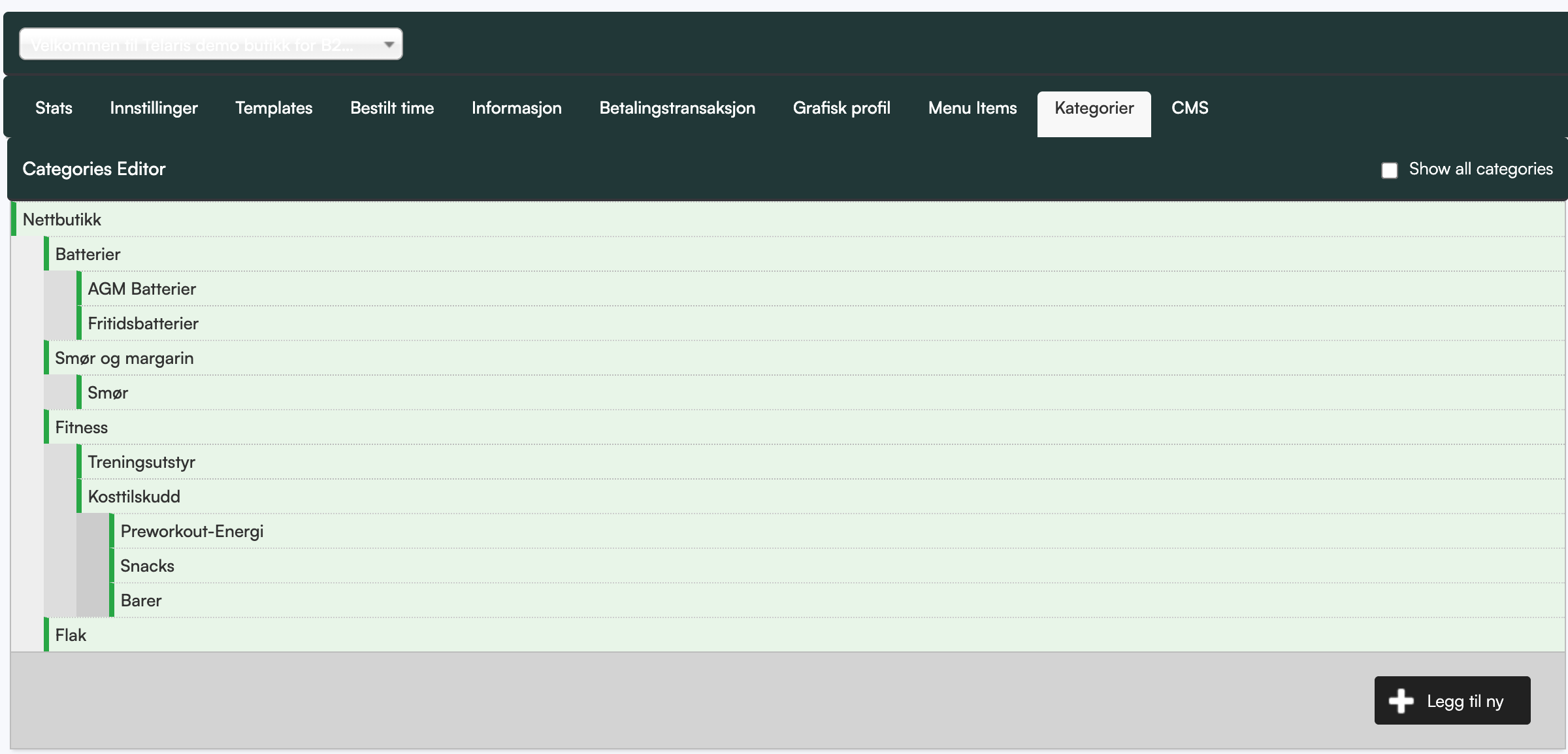 I kategorier kan man gjøre flere innstillinger på en kategori, som å gjøre alle produktene i kategorien tilgjengelige som bestillingsvarer, eller som kun kan hentes i butikk.