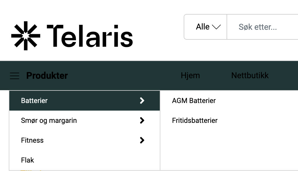 Øverst ligger mor-katergorien for webshopprodukter, ofte kalt 'Nettbutikk' e.l. Dette kalles for rot-katergori, og settes i 'Innstillinger' under 'Webshop' i Telaris
