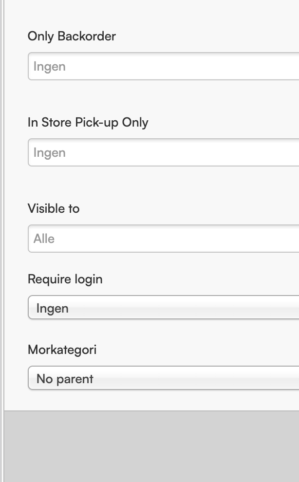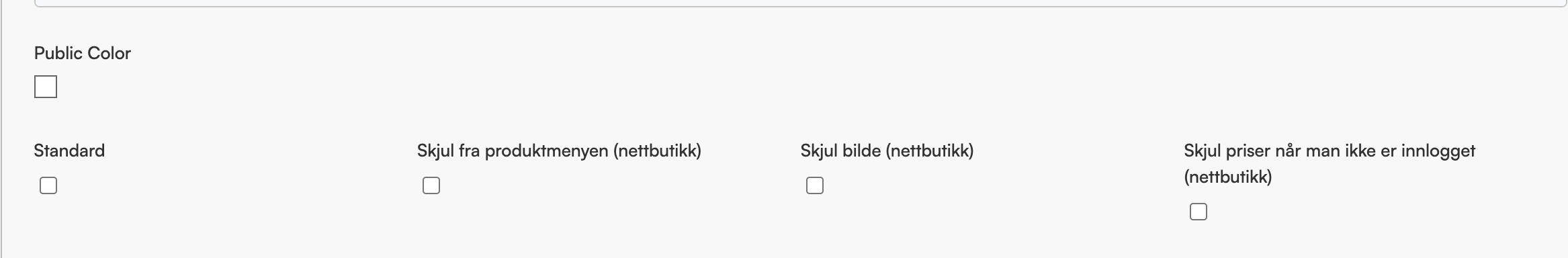 | Skjul priser nå man ikke er innlogget (nettbutikk) | Skjuler pris på alle produkter tilhørende kategorien for alle brukere som ikke er innlogget i webshop. Dersom man skjuler alle priser i innstillinger, så er ikke denne innstillingen nødvendig å skru på |