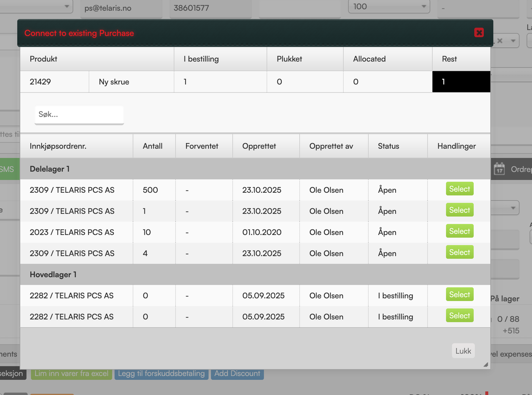 Man får da opp en dialogboks som viser alle aktive innkjøp som inneholder ordrelinjen man ønsker å koble til innkjøpet.