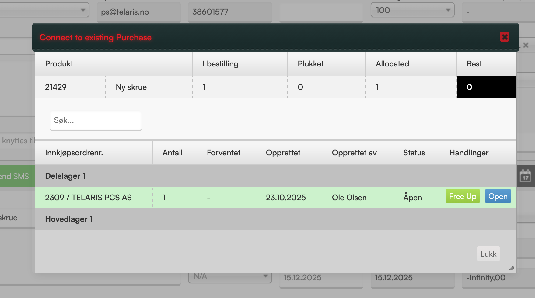 For å frigjøre koblingen mellom ordre og innkjøp, klikk på knappen 'Free up'.