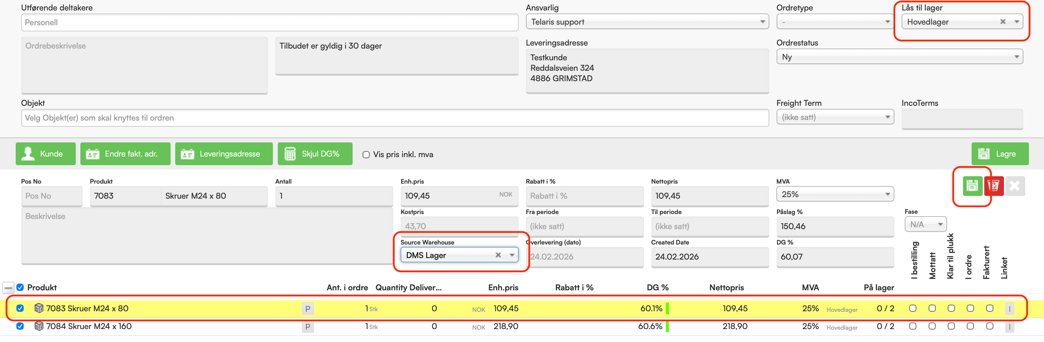 3. Bruk symbol for å lagre ordrelinjen