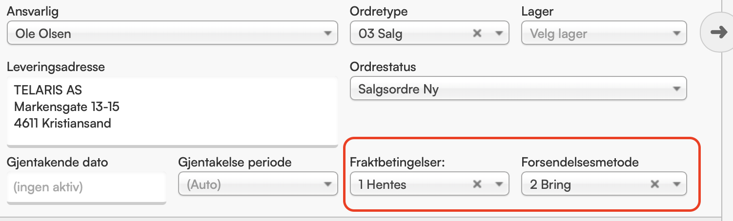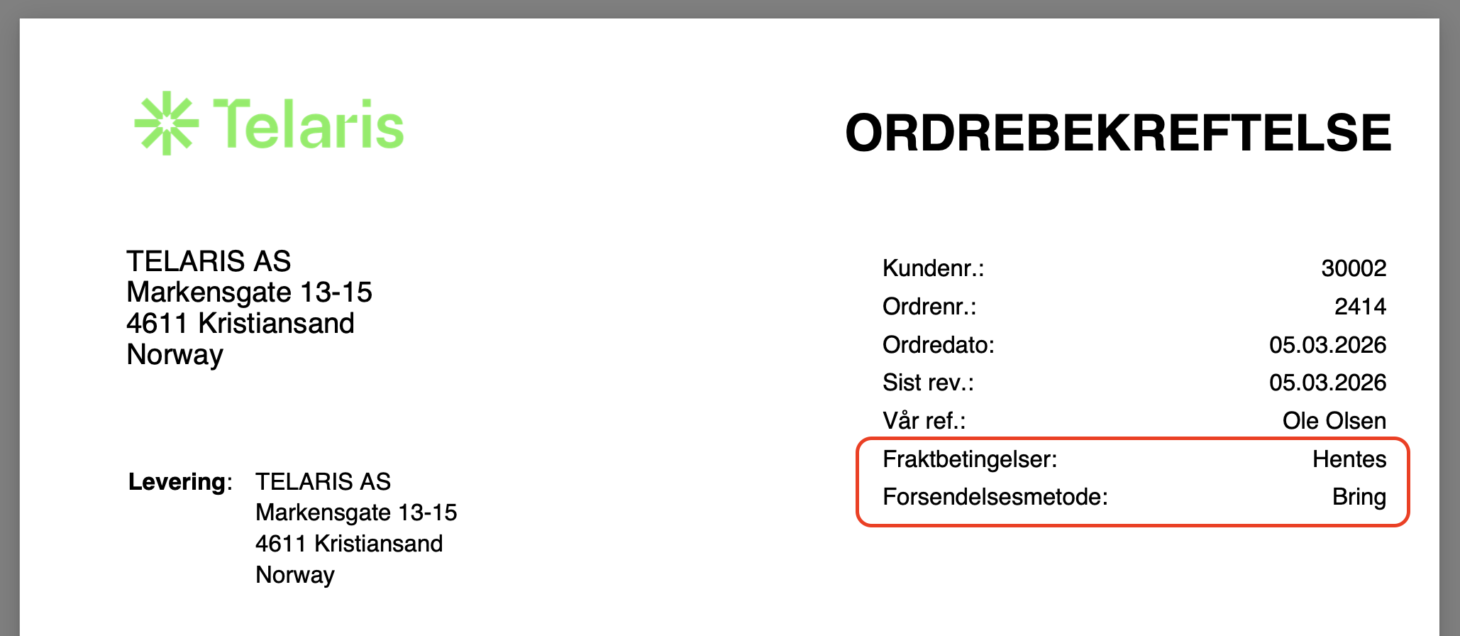 Veiledning for hvordan sette forsendelsesmetode og fraktbetingelser i ordre